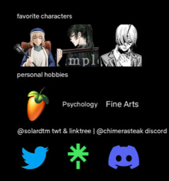 sometimes takes jokes too seriously since i've been through alot irl !! (i try not to </3) extremely protective over my friendsplease do not interact if you are basic dni or just generally judgmental of things people cannot change (unless problematic) also please respect my boundaries if you interact